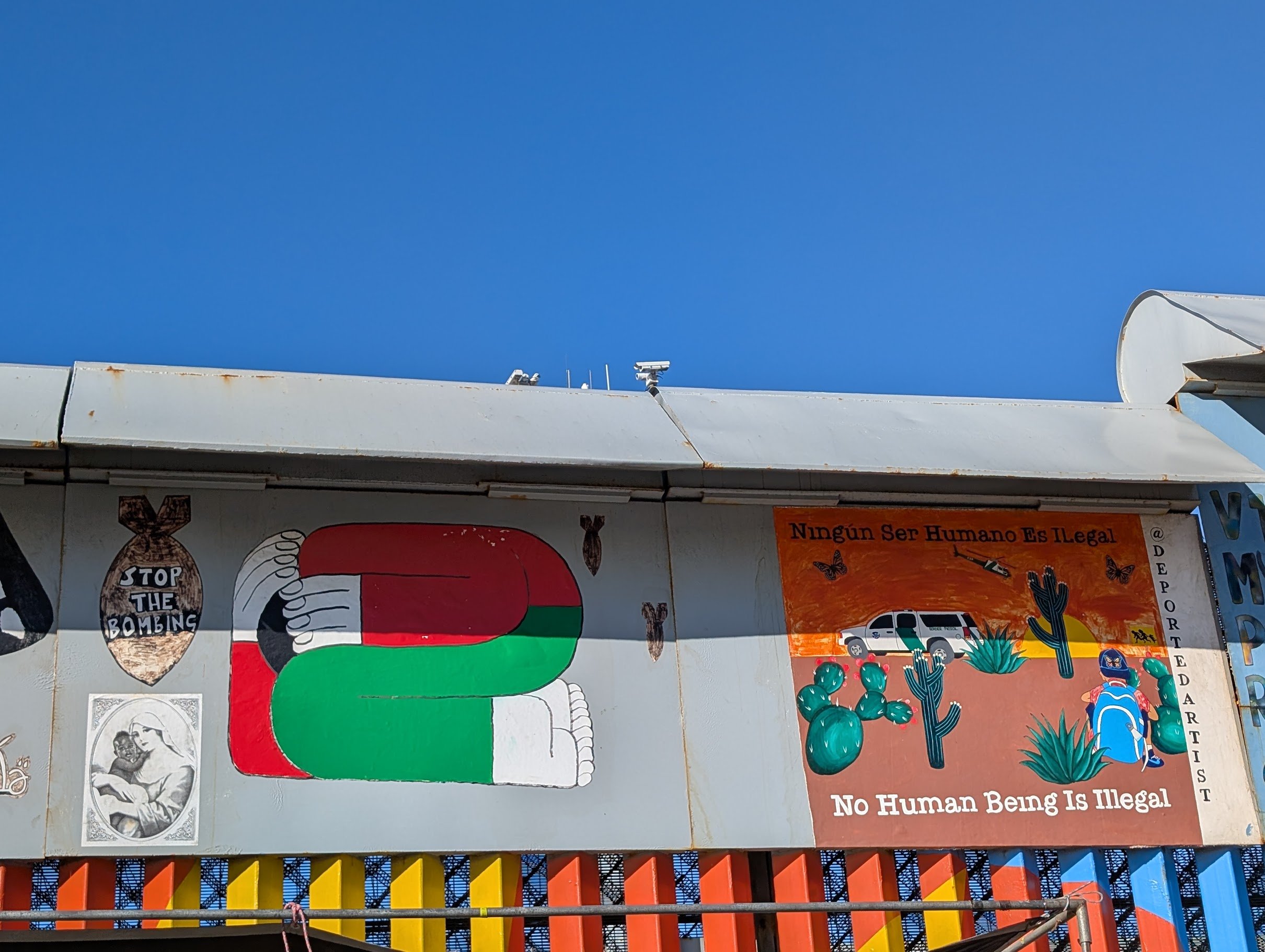 The Border Church meets along the border wall between Tijuana and San Diego in a place called Friendship Park. As I shared when I first visited in March 2025, the Tijuana side still has lovely gardens and park benches and a lighthouse. The U.S. side has been torn up, a second border wall added and a security tower. The wall on the Tijuana side is covered with decorative murals. One reads “REPATRIATE” with the names of all the U.S. deported veterans painted on each beam of the wall. Another mural reads “No Human is Illegal.” But the mural next to the “No Human is Illegal” caught my eye, which shows bombs dropping on a person, who has crouched and covered their face as we were taught in bomb raid drills in the U.S. as schoolchildren. The person is wearing the colors of the Palestinian flag.